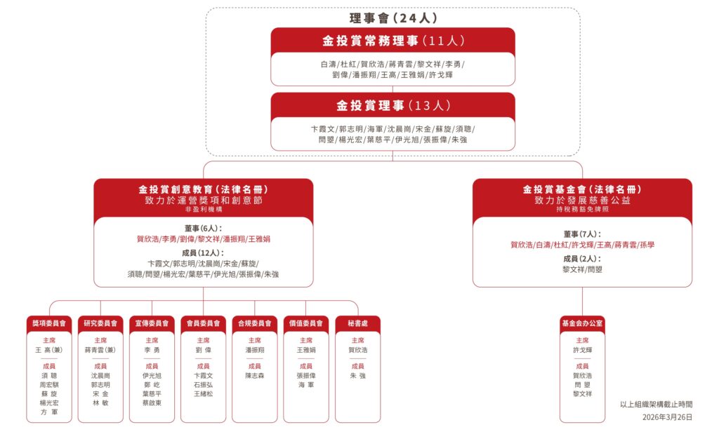 金投賞基金會(慈善機構):持有稅務豁免牌照,專注公益慈善與行業可持續發展的長期投入。